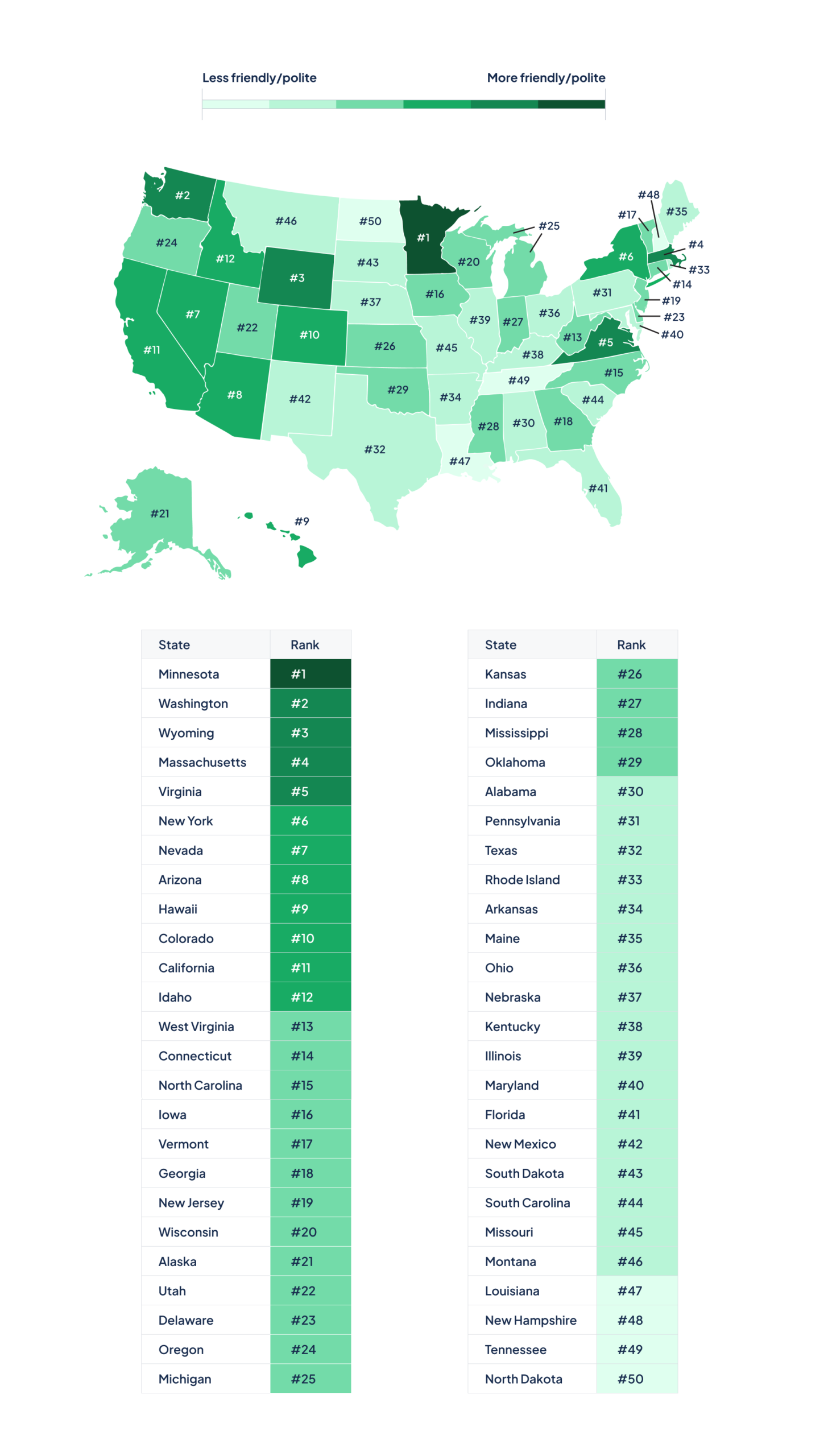 When taking an aggregate of friendliness and politeness into account, these states ranked highest: