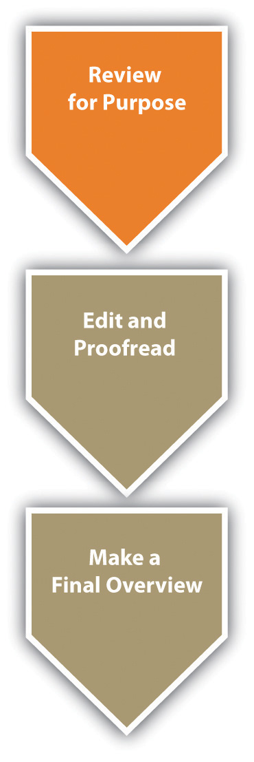 In many situations, you will be required to have at least one of your peers review your essay (and you will, in turn, review at least one peer’s essay). Even if you’re not required to exchange drafts with a peer, it’s simply essential at this point to have another pair of eyes, so find a classmate or friend and ask them to look over your draft. In other cases, your instructor may be intervening at this point with ungraded but evaluative commentary on your draft. Whatever the system, before you post or trade your draft for review, use your answers to the questions in Section 8.1 “Reviewing for Purpose” to tweak your original statement of purpose, giving a clear statement of your desired voice, audience, message, tone, attitude, and reception. Also, consider preparing a descriptive outline showing how the essay actually turned out and comparing that with your original plan, or consider writing a brief narrative describing how the essay developed from idea to execution. Finally, include any other questions or concerns you have about your draft, so that your peer reader(s) or instructor can give you useful, tailored feedback. These reflective statements and documents could be attached with your draft as part of a writer’s memo. Remember, the more guidance you give your readers, regardless of whether they are your peers or your instructor, the more they will be able to help you.
