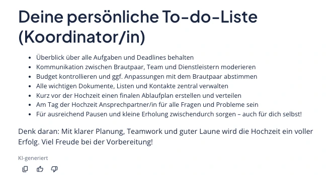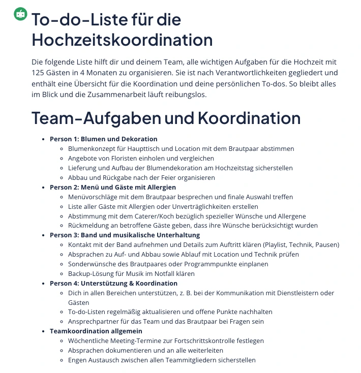Gerade bei Projekten, an denen mehrere Personen beteiligt sind, ist der Einsatz eines KI-Tools zur Erstellung von To-do-Listen sinnvoll. So können Aufgaben klar verteilt und übersichtlich organisiert werden.